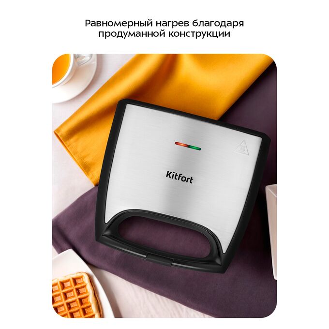 С помощью компактной вафельницы Kitfort КТ-4683 можно приготовить пышные бельгийские вафли на всю семью! В среднем выпекание 2 вафель до золотистой корочки займёт 3-5 минут. Прибор компактный и не займёт много места на кухне.