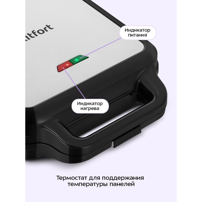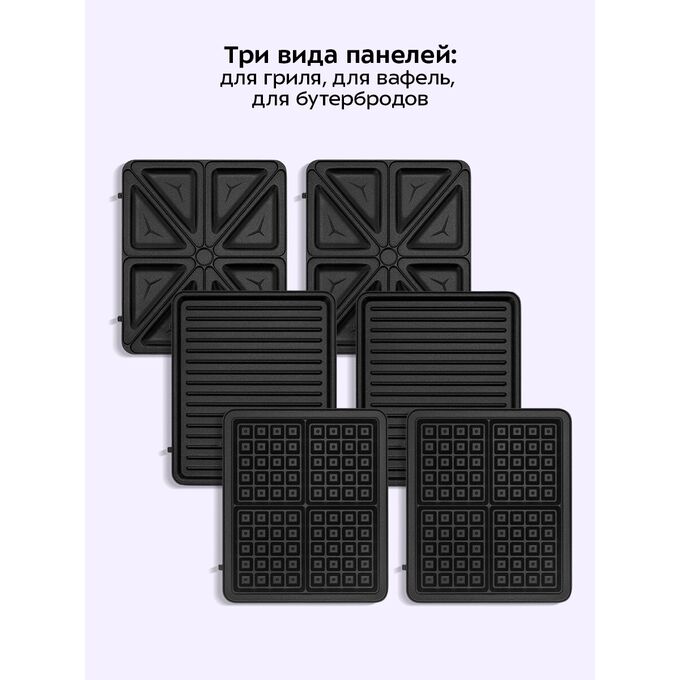В набор входят три съёмные пары панелей: панели для приготовления вафель, панели для приготовления бутербродов и ребристые панели для гриля. Высокая температура нагрева панелей способствует быстрому приготовлению продуктов.