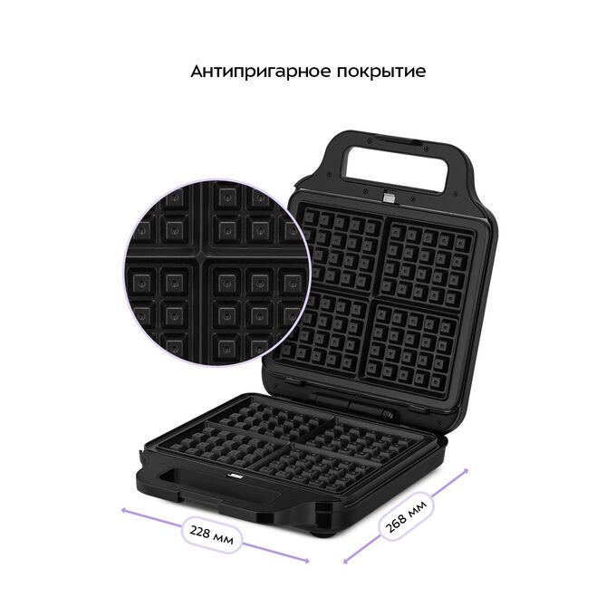 Панели имеют антипригарное покрытие, что позволяет легко и просто готовить любимый десерт. Благодаря такому покрытию готовить вафли можно с минимальным количеством масла или без него.