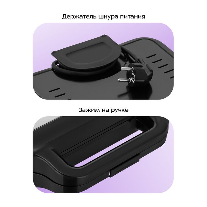 Держатель шнура на нижней части корпуса обеспечивает удобство хранения. Зажим на ручке удерживает крышку вафельницы в закрытом состоянии, что делает готовку, транспортировку и хранение более удобными.