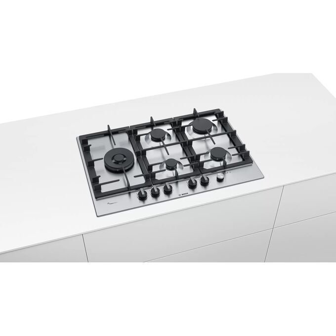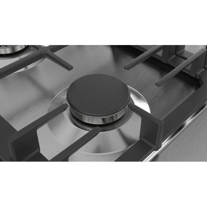 Встраиваемая варочная поверхность BOSCH PCS7A5I90 Газ, 75см, нерж.сталь, независимая, нержавеющая сталь, чугунные решетки