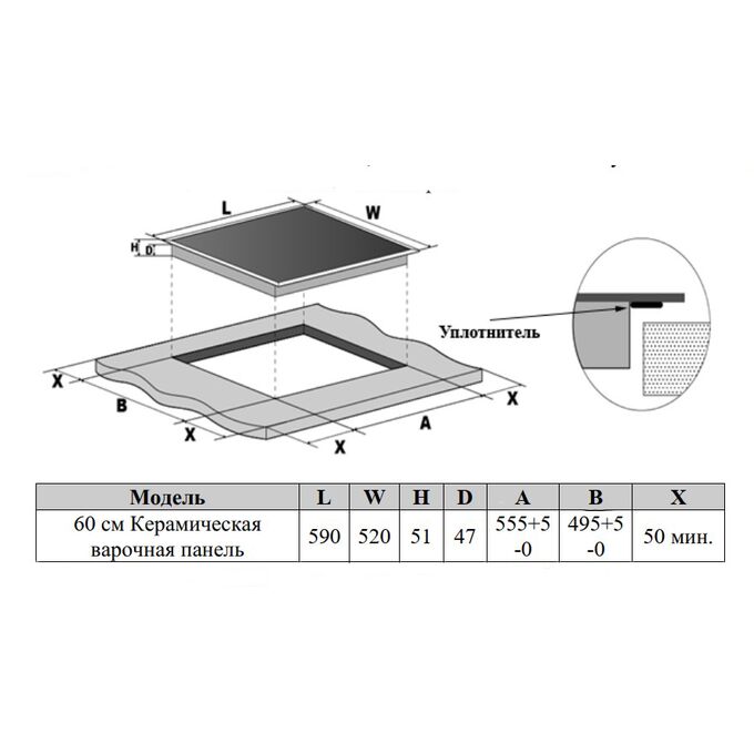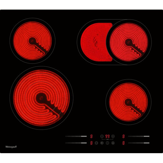Конфорки: 4 конфорки: Тройная зона: ⌀230/175/138мм, 2300/1500/700Вт , 2- ⌀165 мм, 1200 Вт, Овальная зона: 270*165 мм, 2000/1100 Вт
