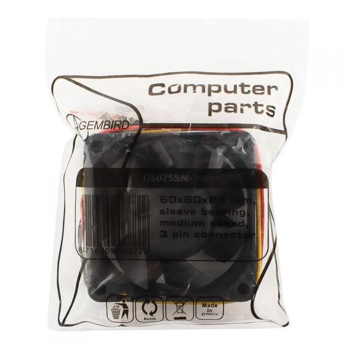 Вентилятор 60 мм Gembird D6025SM-3, 60x60x25, 3 pin 4000 rpm, 25 dBA, втулка (sleeve), MTBF: 30000 часов, длина провода 25 см