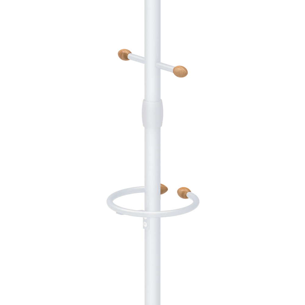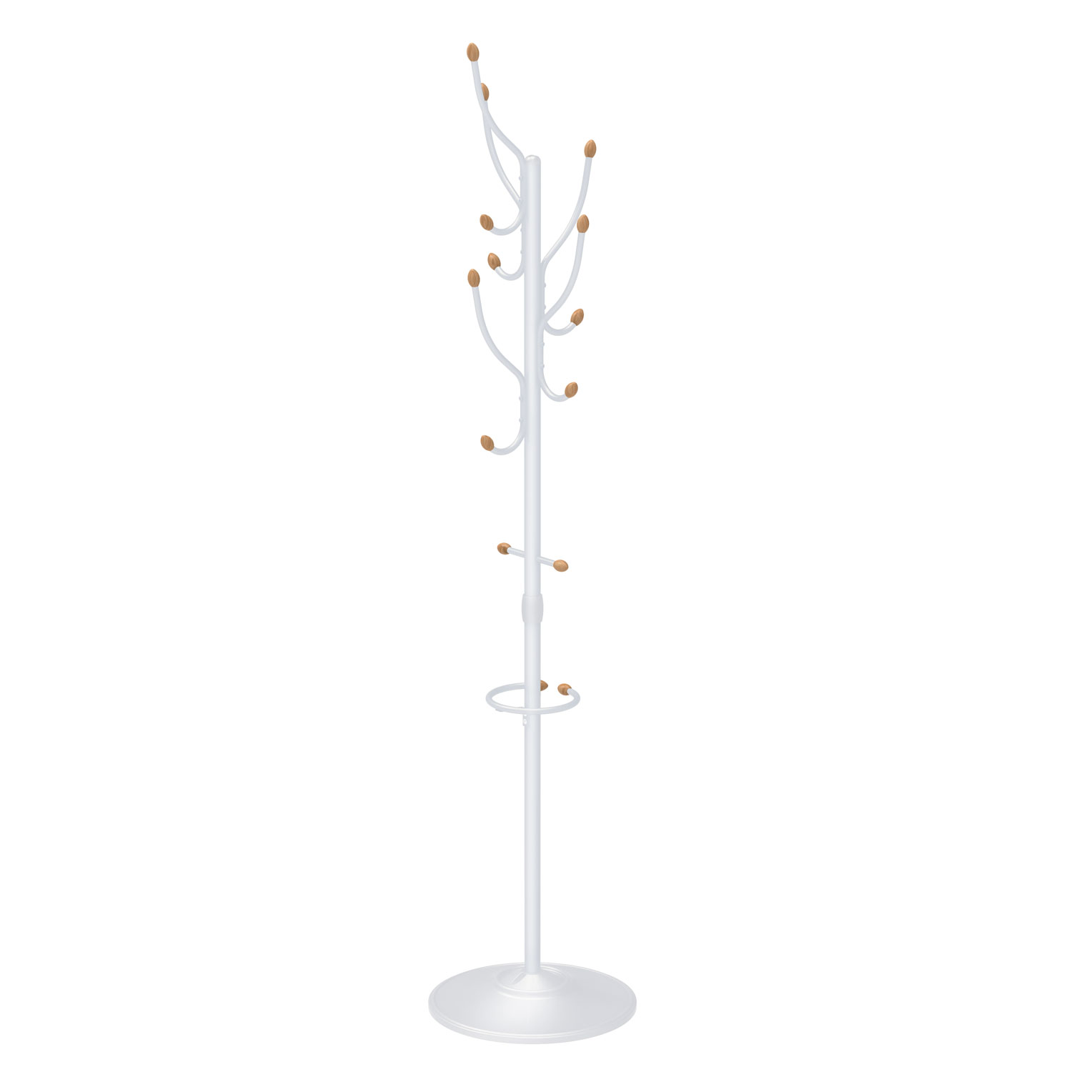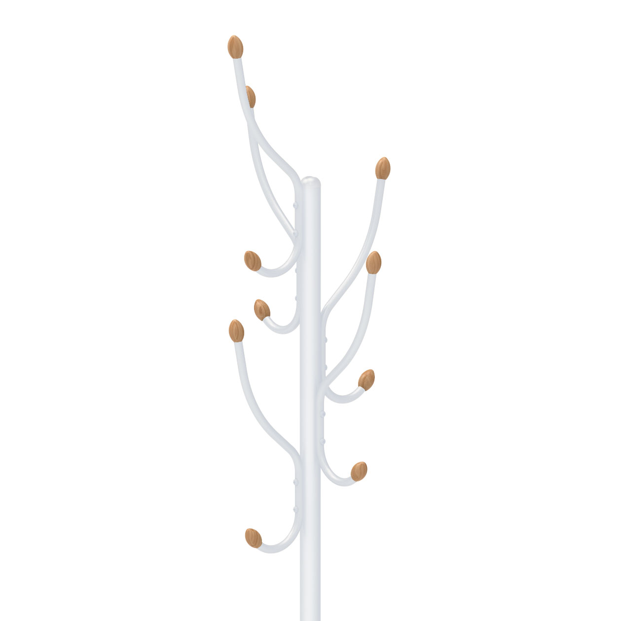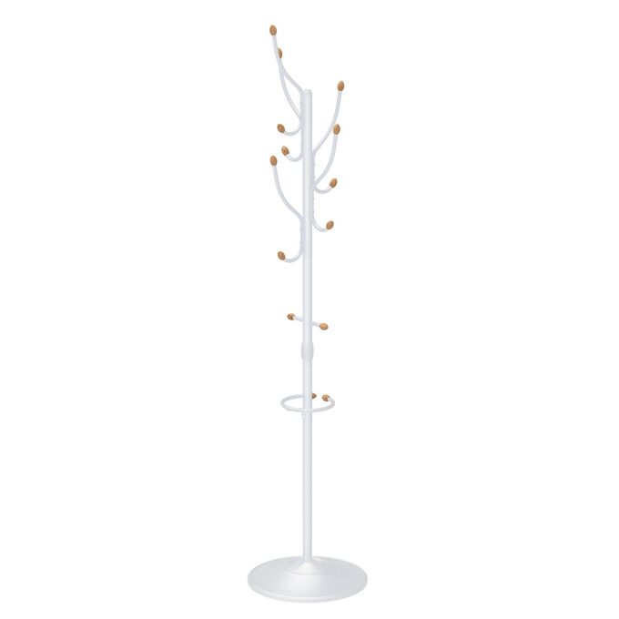 Напольная вешалка оригинальной формы с декором из дерева на круглом основании.