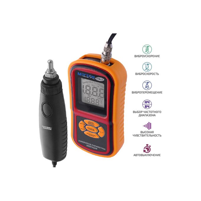 Измеритель вибрации позволяет измерять виброускорение, виброскорость и амплитуду колебаний с точностью до ± 5% ± 2 знака, а также температуру в диапазоне от -10°C до +80°C. Он работает посредством пьезоэлектрического эффекта в искусственно созданной поляризованной керамике. Устройство оснащено длинным и коротким щупами, предназначенными для использования в различных случаях измерения. Автоматическое отключение прибора после 60 секунд бездействия обеспечивает экономию заряда батареи.
