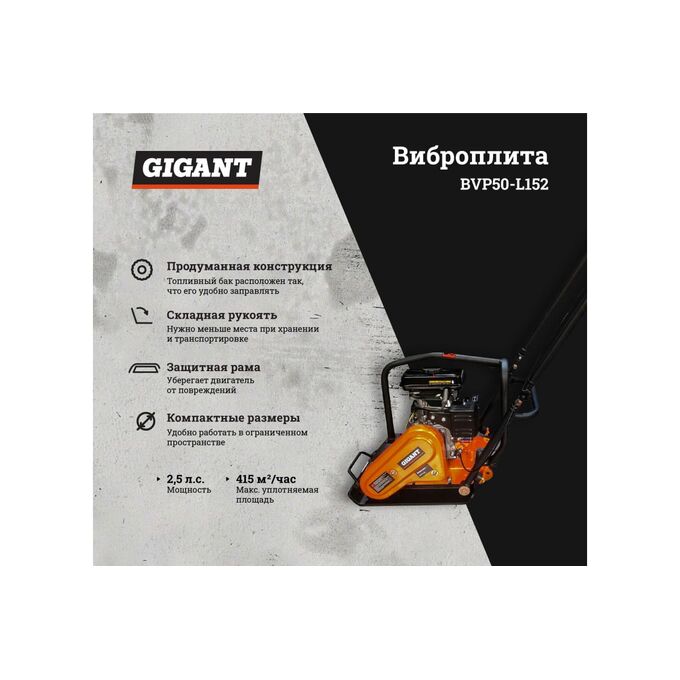 Виброплита Gigant BVP50-L152 используется на небольшой строительной площадке. Обеспечивает эффективное уплотнение сыпучих материалов: песка, гравия, а также смешанного грунта.