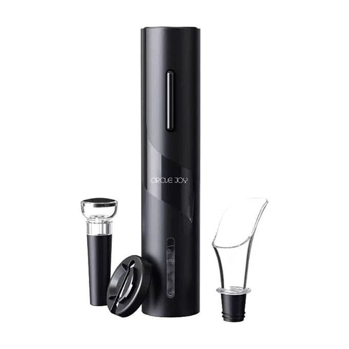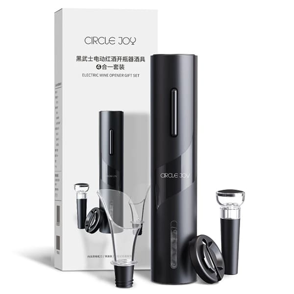 Circle Joy 4 in 1 (CJ-TZ07) – набор для вина, включающий 4 предмета: электроштопор, вакуумную пробку, декантер и нож для срезания фольги. Аксессуары помогут за считанные секунды открыть бутылку и красиво разлить напиток по бокалам. Благодаря изящному дизайну набор хорошо впишется в интерьер кухни.