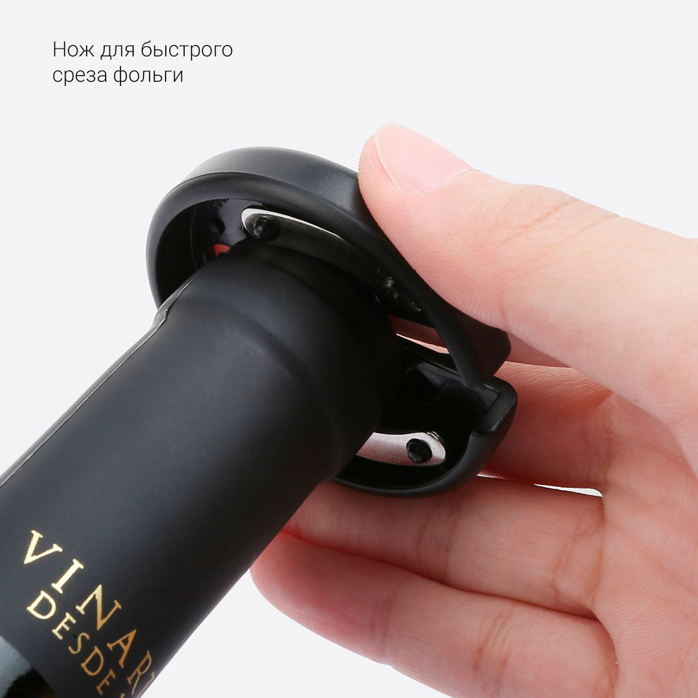 Перед тем, как вынуть из бутылки пробку, нужно аккуратно срезать упаковку с горлышка. В этом поможет компактный и безопасный нож для фольги. Всего одно движение, и этикетка снята.