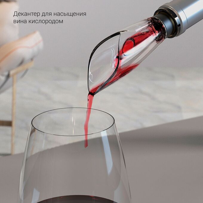 Декантер из набора имеет универсальные размеры, поэтому подойдет для любых винных бутылок. С его помощью можно не только красиво разлить напиток по бокалам, но и обеспечить его насыщение кислородом. Воздушные пузырьки попадают в вино по специальным отверстиям. Они позволяют напитку оставаться вкусным и ароматным.