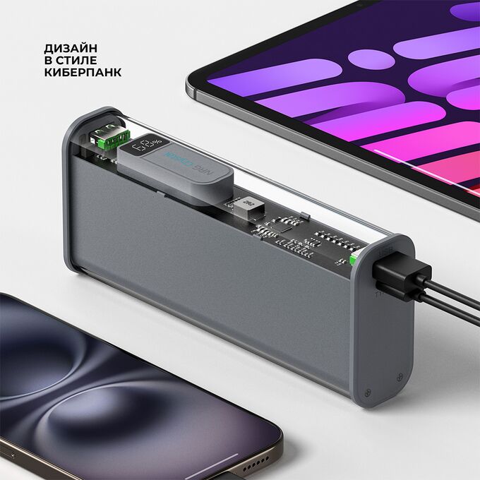 Назначение: Устройство предназначено для восполнения заряда портативной техники, способной питаться от портов USB A и USB C с напряжением не более 12V и мощностью не превышающей 20Вт, передавая энергию от встроенного аккумулятора.