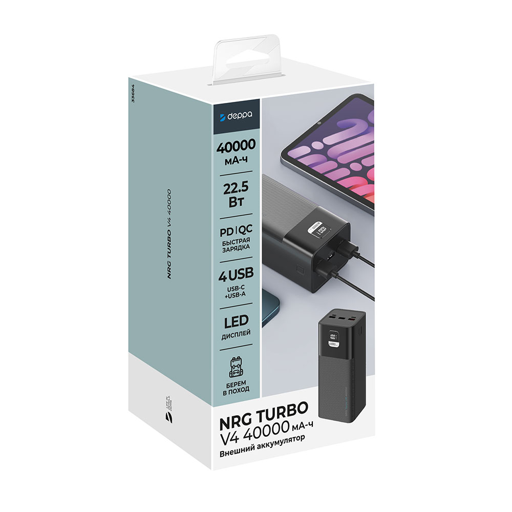 Внешний АКБ NRG Turbo V4 40000 мА-ч, дисплей, черный, Deppa