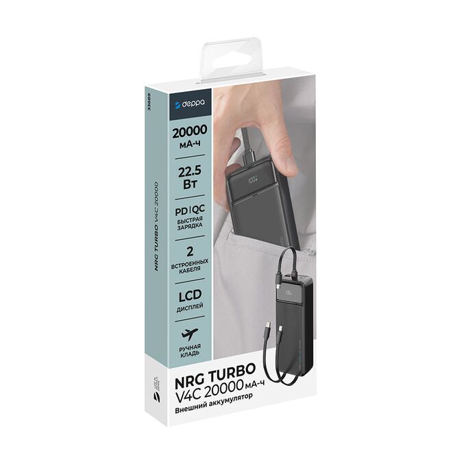 Внешний АКБ NRG Turbo V4c 20000 мА-ч, дисплей, черный, Deppa