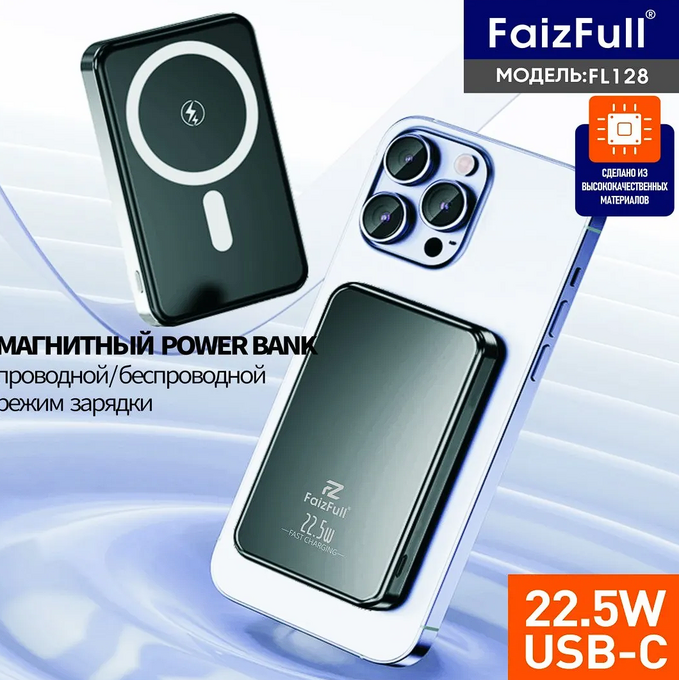 Внешний аккумулятор FaizFull FL128, 10 000 мА·ч, MagSafe, PD 22,5 Вт, чёрный.