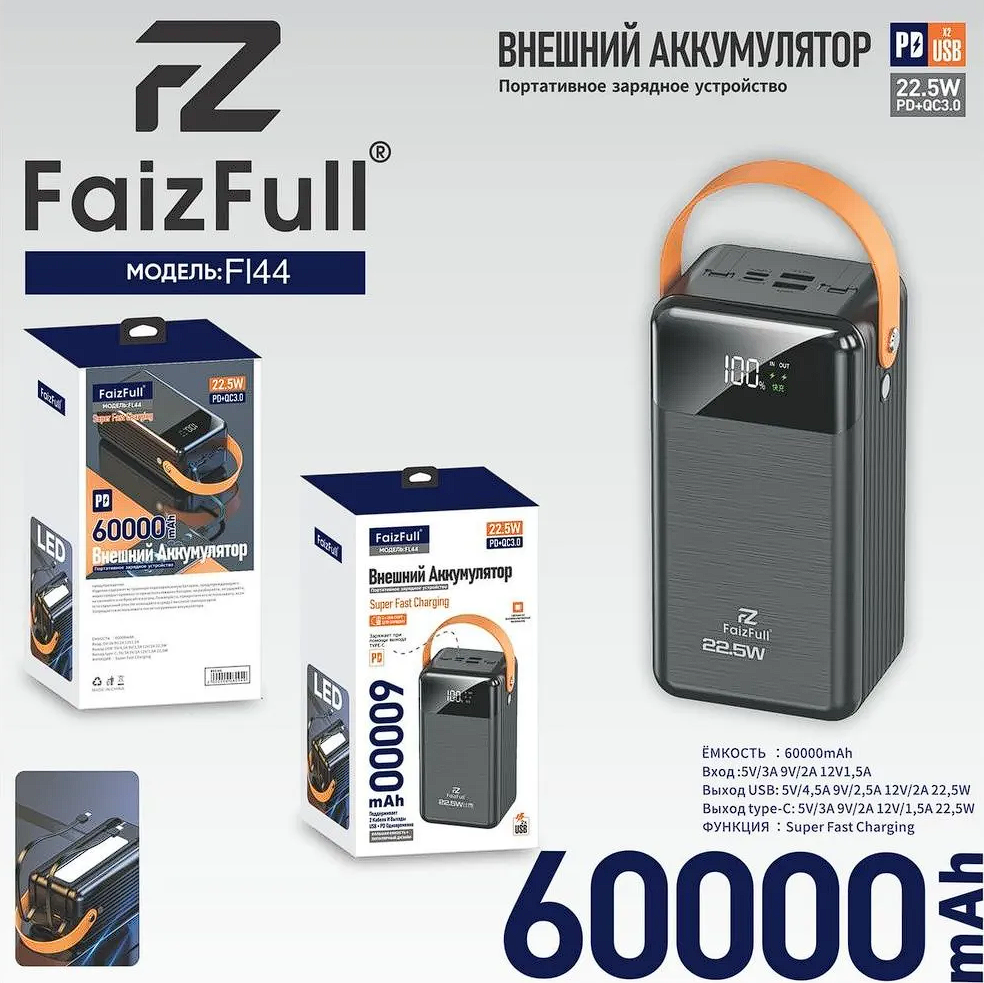 Портативный аккумулятор FaizFull FL44 60000 mAh – универсальное мощное зарядное устройство для быстрого и надежного питания ваших гаджетов.