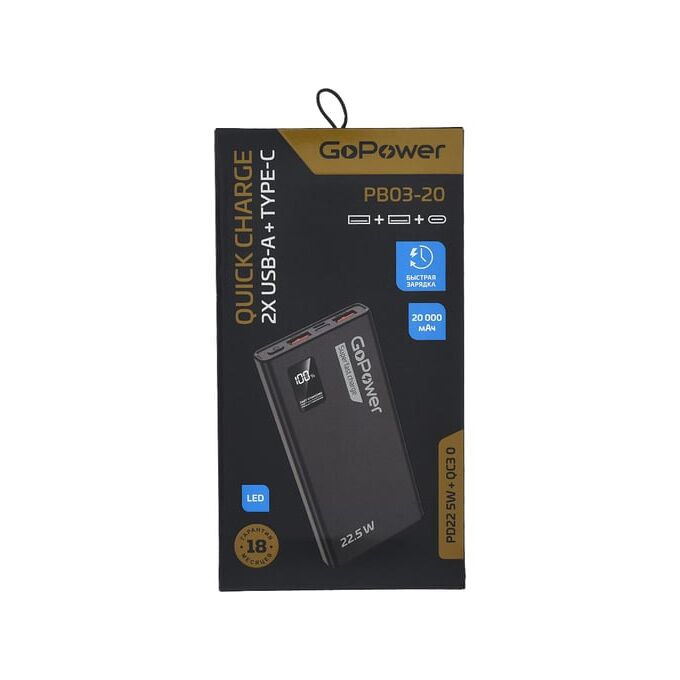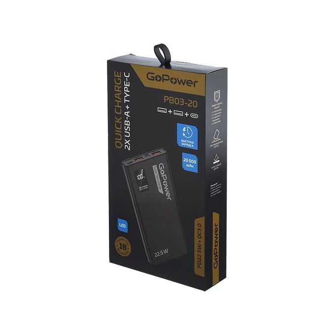 Внешний аккумулятор GoPower PB03-20 20000mAh 3.0A 22.5W 2USB/Type-C черный (00-00029660)