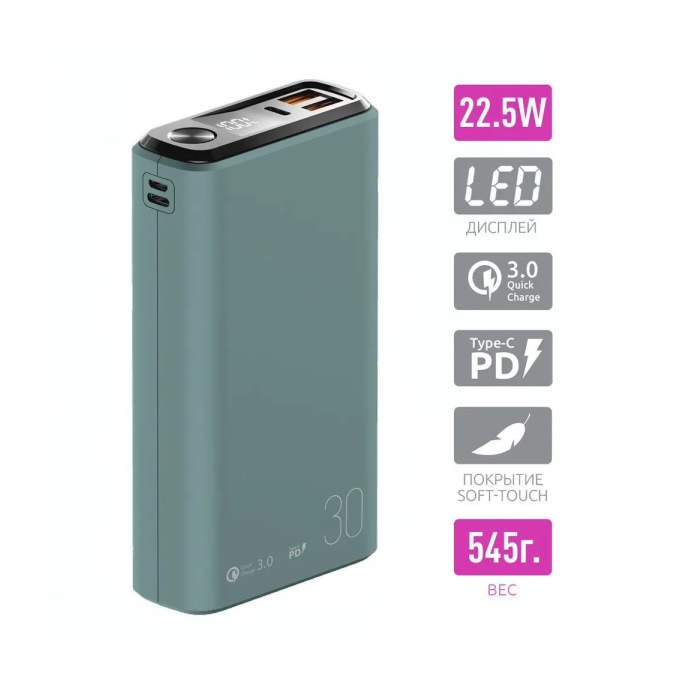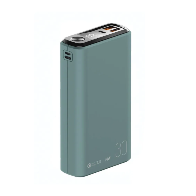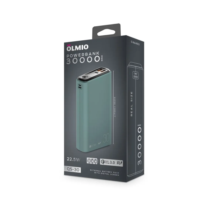 Внешний аккумулятор OLMIO QS-30, 30000mAh, 22.5W, QuickCharge3.0/PowerDelivery, LCD, темно-зеленый