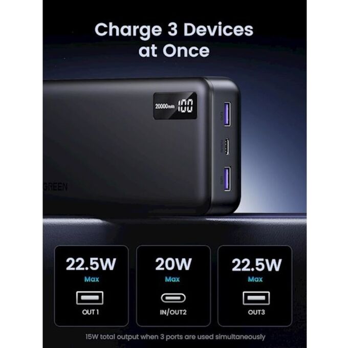 Внешний аккумулятор UGREEN PB312 (25683) 20000mAh Two-Way Fast Charging 2*USB-A&1*USB-C 20W серый