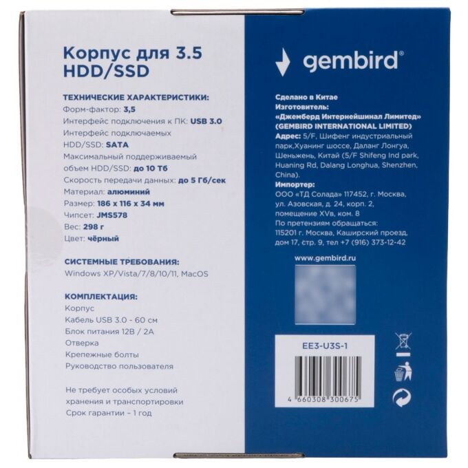 Внешний корпус Gembird EE3-U3S-1 USB 3.0 для 3.5" HDD/SSD Gembird, порт Type-A, SATA III, металл, чёрный