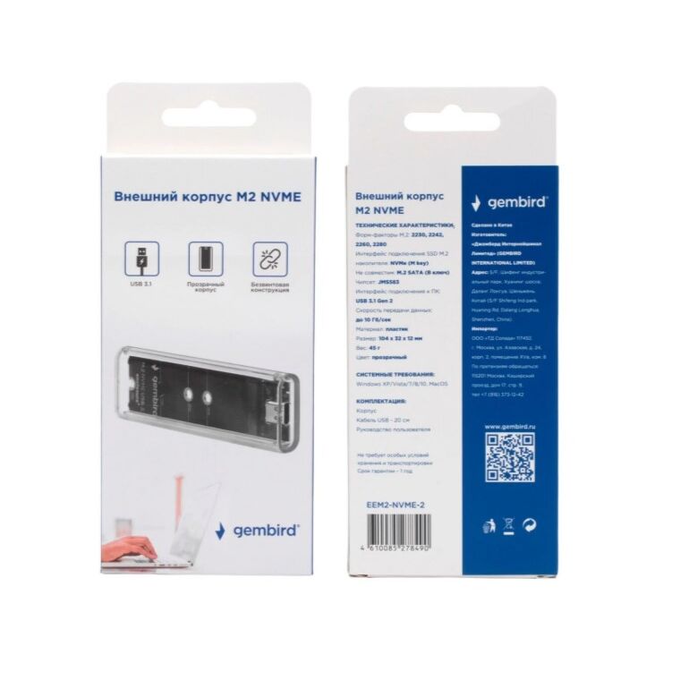 Внешний корпус Gembird EEM2-NVME-2 USB 3.1 для M2 NVME порт Type-С, пластик, прозрачный