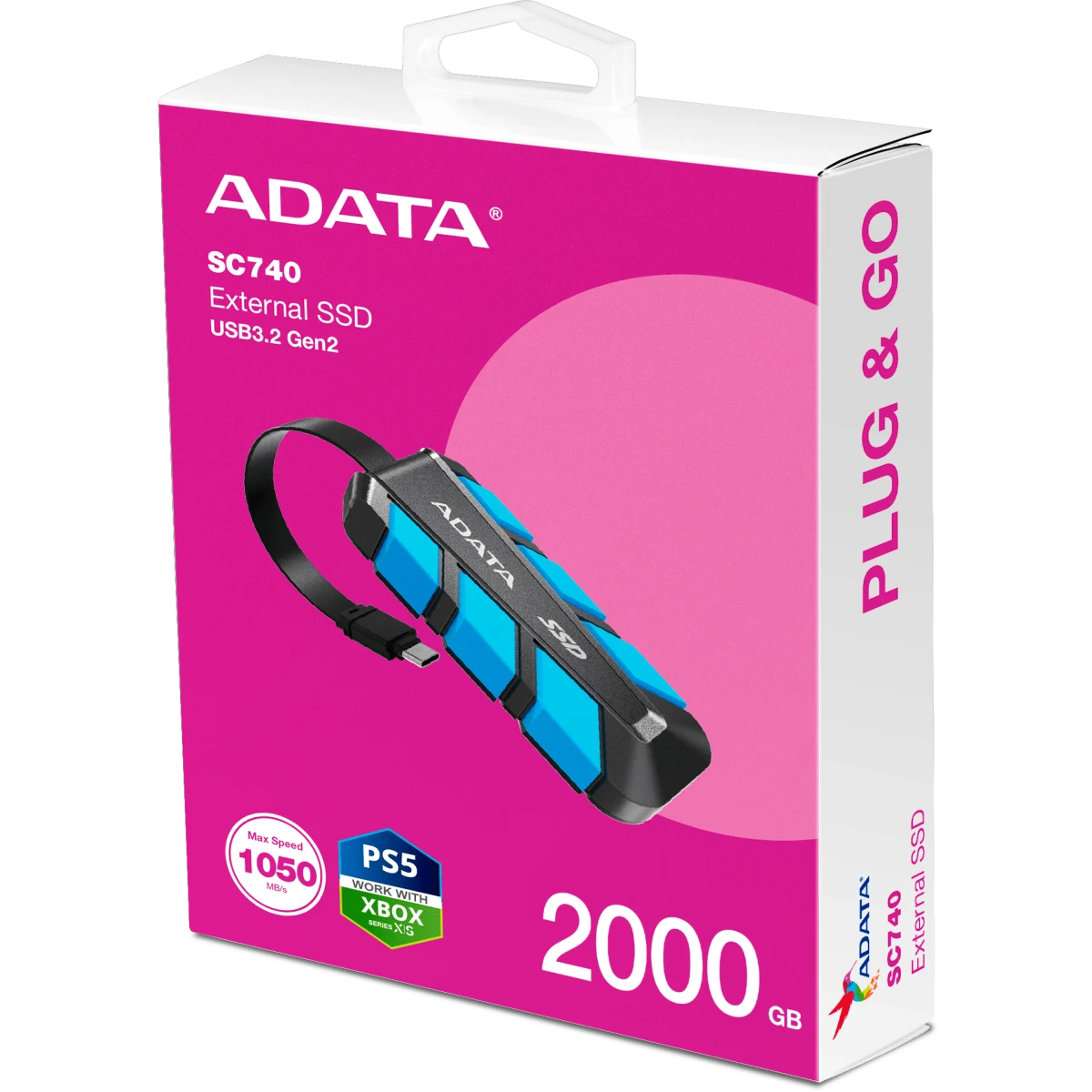 Внешний SSD ADATA SC740 (SC740-2000G-CBU) 2.0Tb (USB3.2 gen 2 type C, 1050/1000Mbs, 122x41x22mm, 40g, защита от падения, встроенный кабель)
