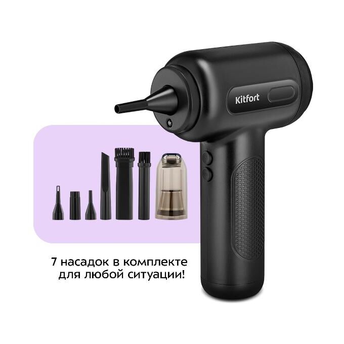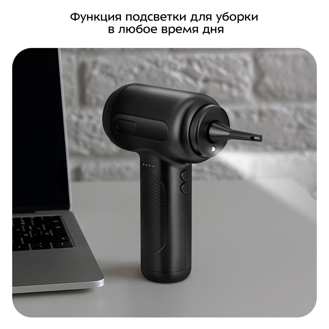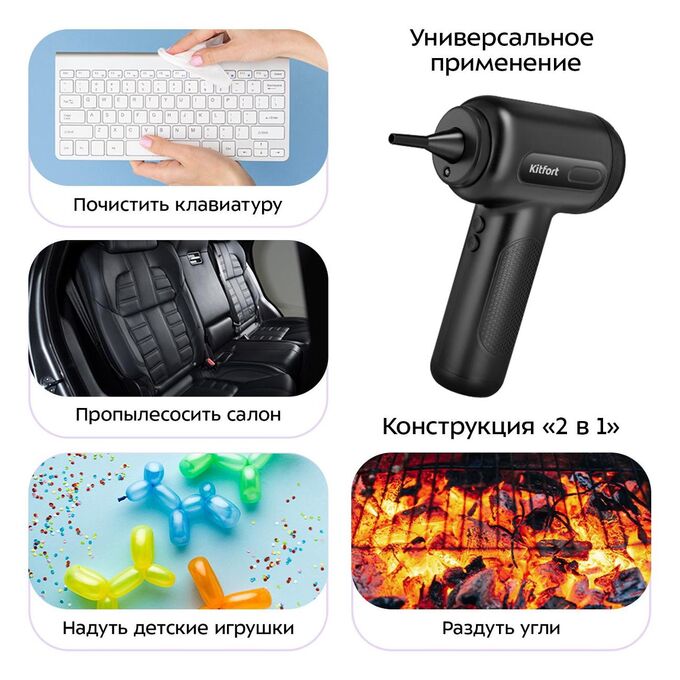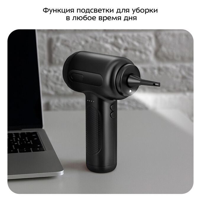 Подсветка. 8 насадок в комплекте: универсальная насадка, насадка-щётка, насадка-концентратор, насадки для накачки мелких и крупных надувных изделий, узкая насадка, плоская насадка-щётка и насадка-пылесборник.