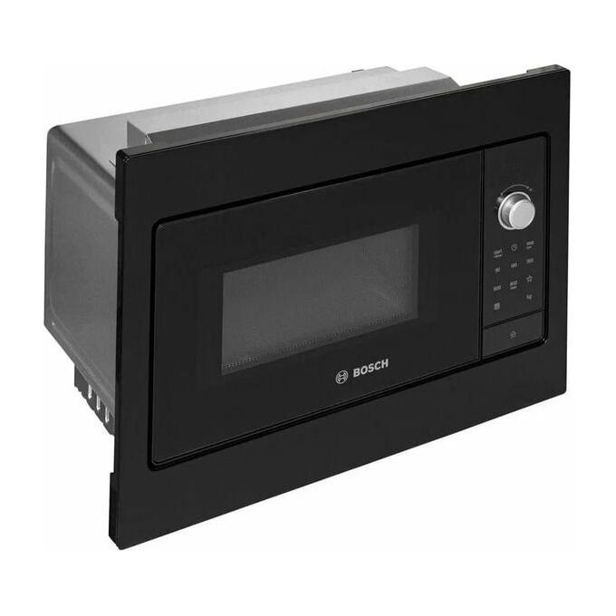Микроволновая печь Bosch BFL523МВ3 в корпусе черного цвета оборудована рабочей камерой объемом 20 л, сенсорным блоком управления и цифровым экраном. Внутри есть LED-подсветка. Передняя панель сделана из стекла и металла, внутренние стенки — из нержавеющей стали. Диаметр поворотного стола — 27 см.