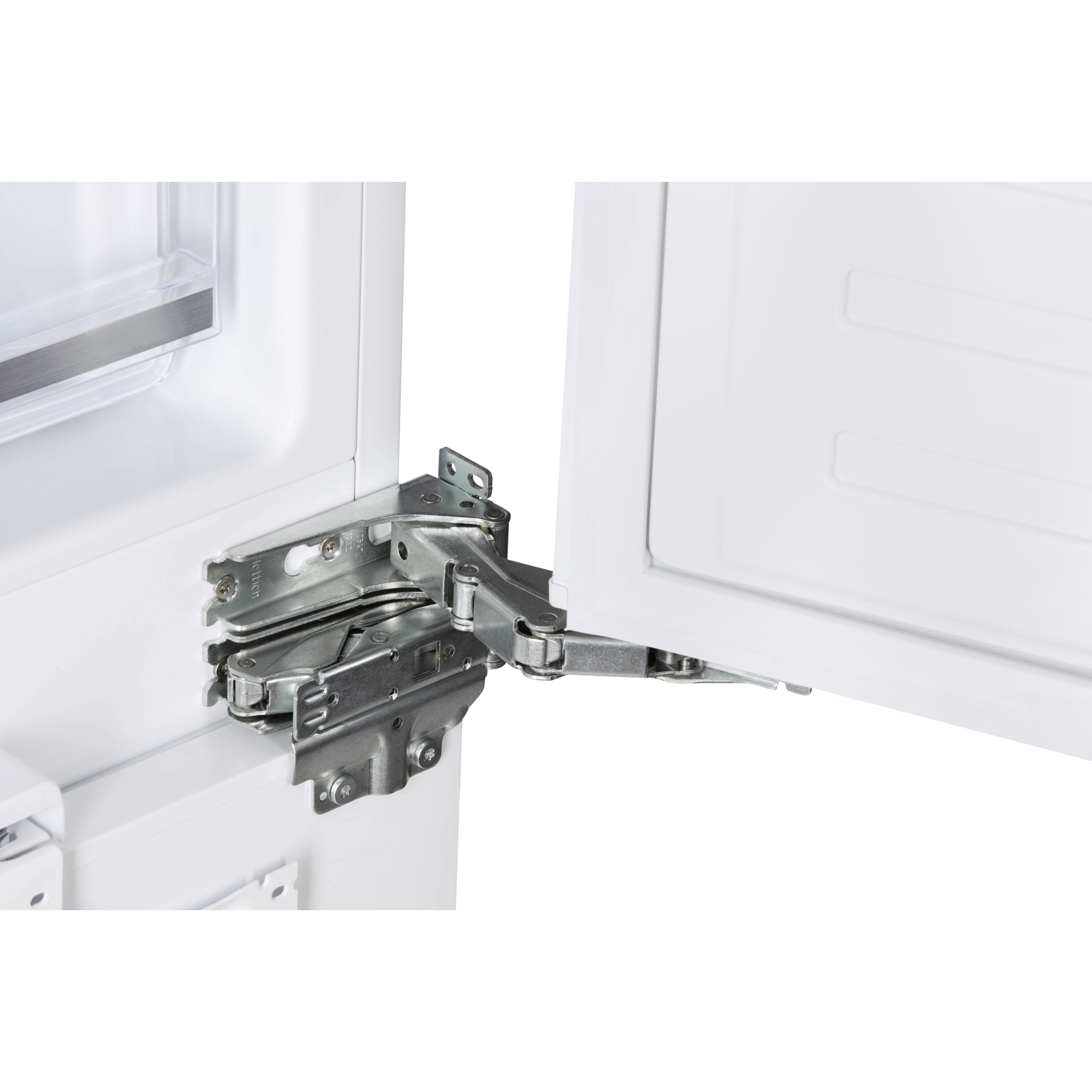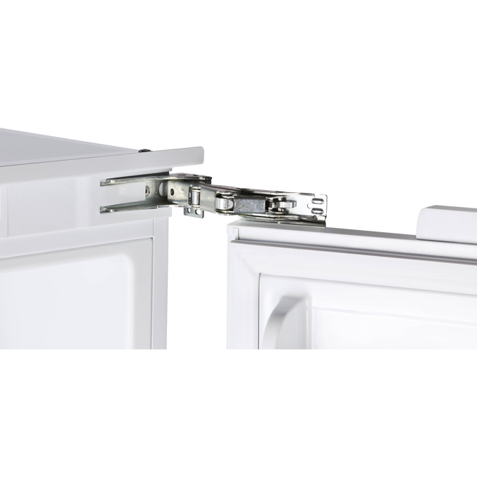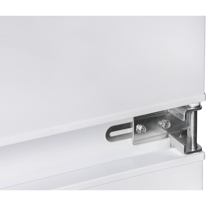 Модель имеет жесткую систему крепления фасадов с фиксированными петлями. При таком монтаже фасады совершенно не связываются с корпусом холодильника. Конструкция имеет высокую жесткость, не ограничена углом открывания и не имеет зазоров, в которых может скапливаться пыль и грязь.