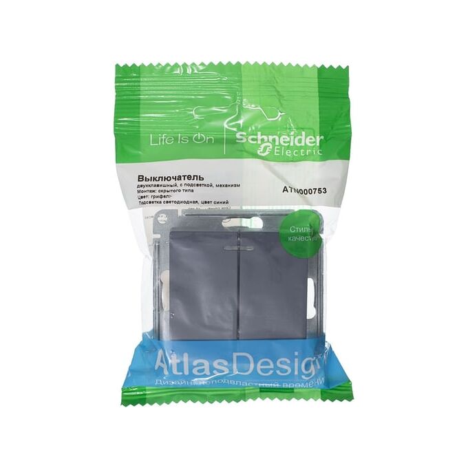 Выключатель Systeme electric AtlasDesign ATN000753 двухклавишный с подсветкой схема 5а 10АХ механизм грифель