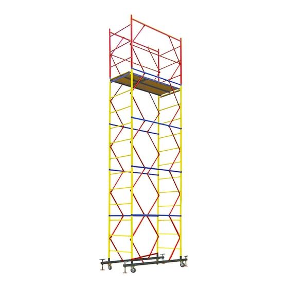 За счет ширины базового блока на ней комфортно работать сразу нескольким людям, разместив весь необходимый инструмент и материалы. Легко собирается без необходимости использования специального инструмента (все элементы соединяются флажковыми механизмами). Ее просто перемещать по объекту за счет наличия больших прорезиненных колес, которые также снабжены фиксаторами положения.