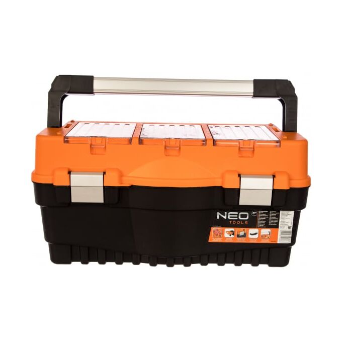 Ящик для инструмента 21" NEO 84-105 подходит для транспортировки ручного инструмента и крепежа. За счет дополнительных углублений и поддона крепеж легко сгруппировать. Грузоподъемность составляет 20 кг.