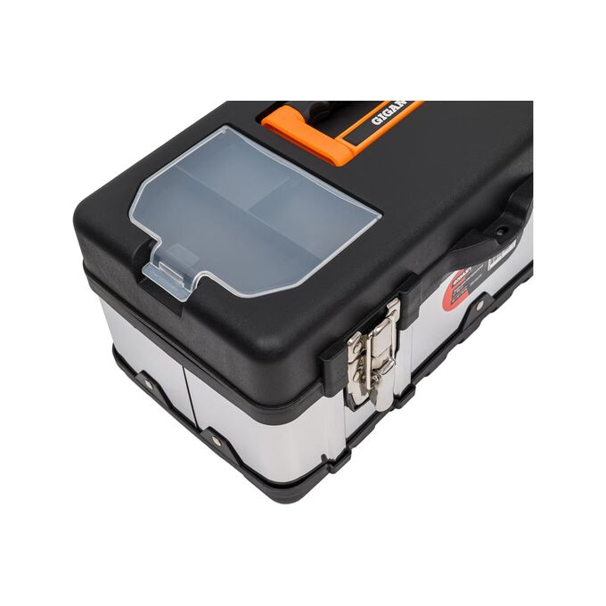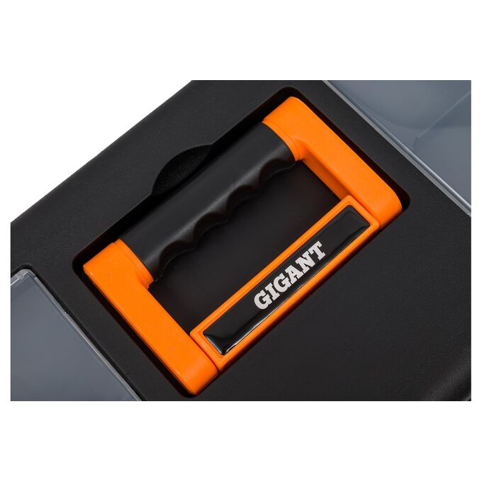 Ящик для инструментов Gigant 17" BX-17 оснащен встроенными в крышку органайзерами для хранения мелких деталей. Сделан из ударопрочного пластика. Широкая металлическая защелка придает дополнительную прочность и позволяет открывать/закрывать ящик одной рукой.