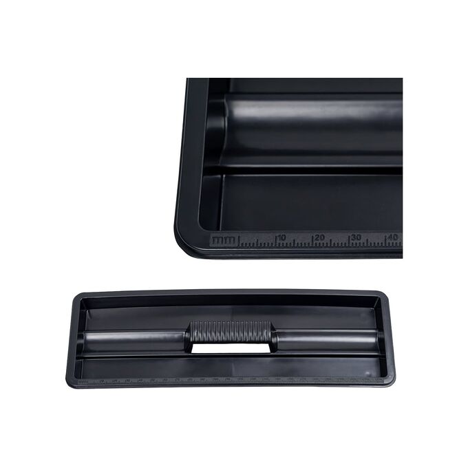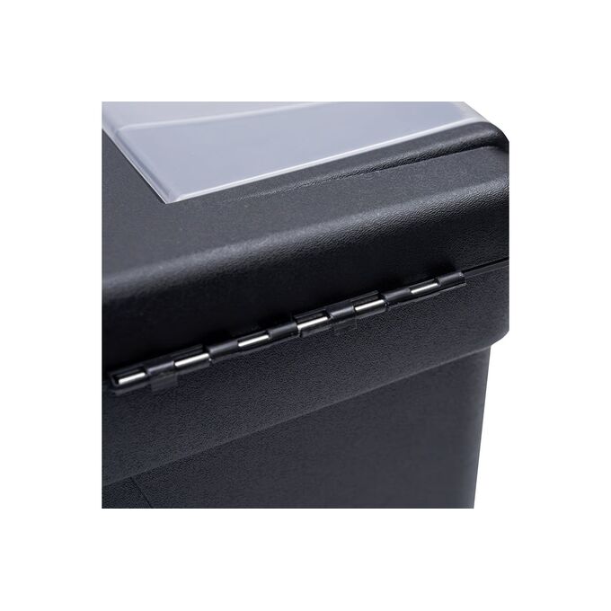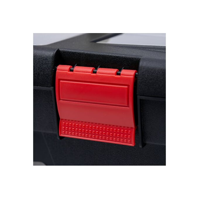 Достаточно широкие замки предотвращают самопроизвольное открытие крышки ящика. Встроенные в крышку органайзеры позволяют разместить в них большое количество мелких деталей и метизов.