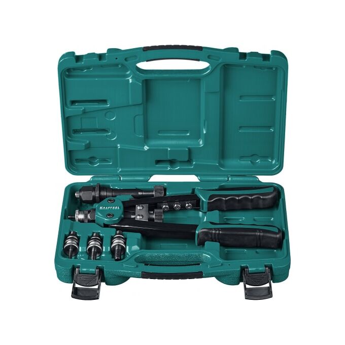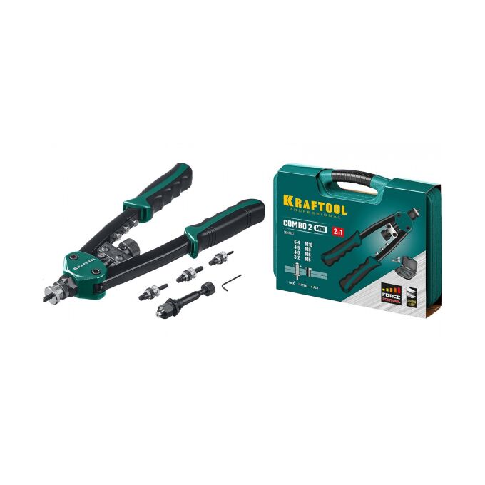 Заклепочник KRAFTOOL Combo2-M10 комбинированный двуручный в кейсе, резьбовые заклепки М5-М10, 31181 - это компактный и надежный инструмент, который с легкостью выдерживает высокие нагрузки. Данная модель предназначена для установки резьбовых и вытяжных заклепок. Резьбовая заклепка установлена, когда образовался бортик. Дальнейшее вытягивание приводит к поломке насадок.