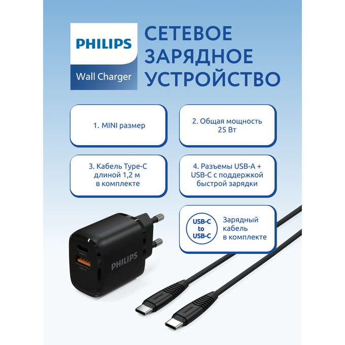 Зарядное устройство для телефона Philips DLP2560DB/97 Travel, USB-C и USB-A, 25W, кабель Type-C Type-C, быстрая зарядка QC3.0, чёрный