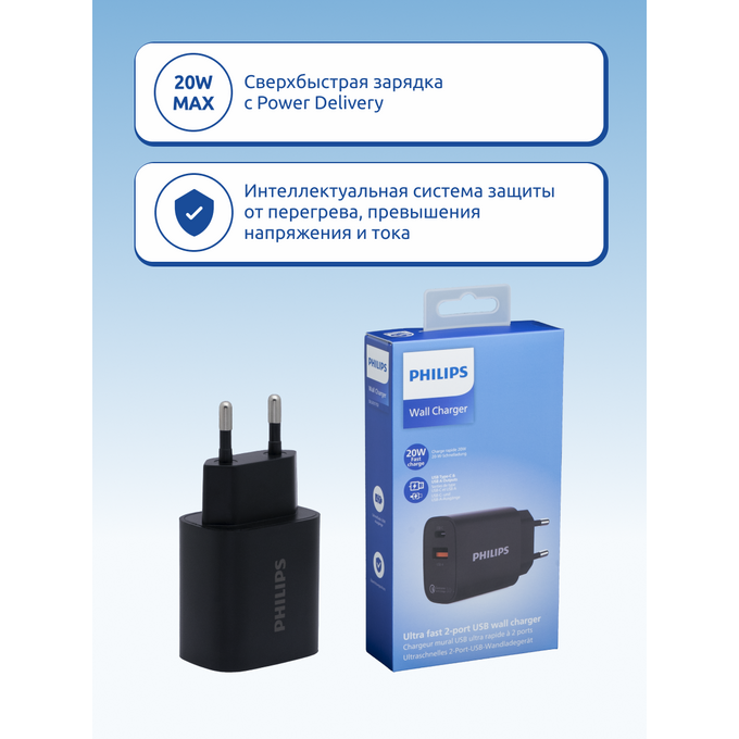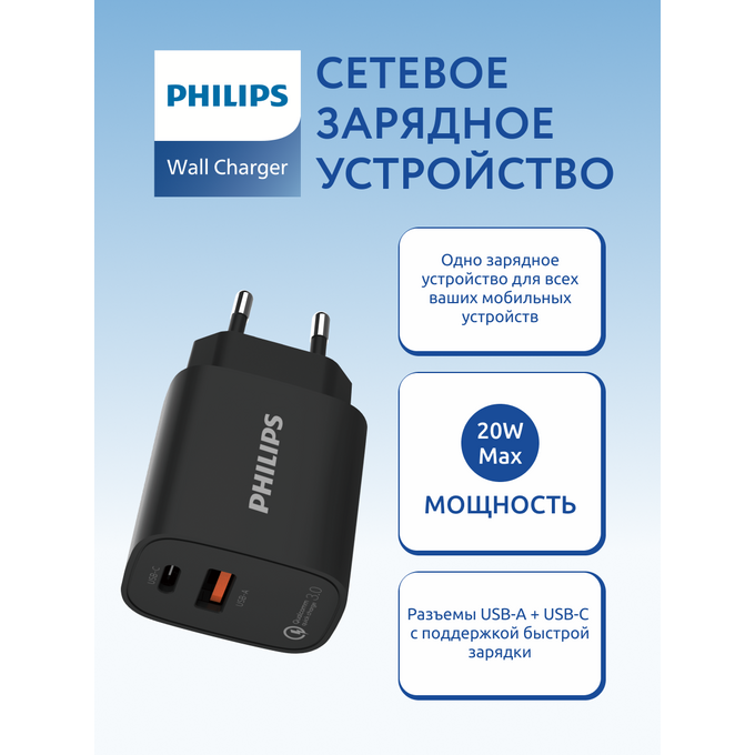 Зарядное устройство для телефона Philips DLP4317CB/70, USB-C и USB-A, 20W, быстрая зарядка QC3.0, чёрный