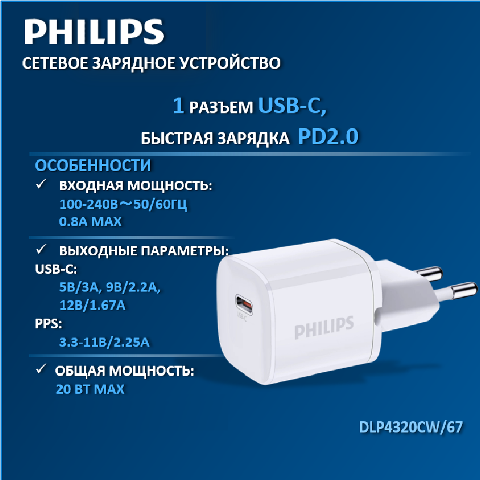 Зарядное устройство Philips MINI GAN DLP4320CW/67 – идеальный выбор для тех, кто ценит скорость и компактность. С этим сетевым зарядным устройством вы сможете быстро и безопасно заряжать ваши устройства. Благодаря новейшей технологии GaN, этот зарядный блок для телефона предлагает высокую мощность, занимая при этом минимум места. Сетевые зарядные устройства, в которых используется технология GaN (нитрид галлия), потребляют меньше электрических компонентов и обладают лучшей теплоотдачей Компактные зарядные устройства обеспечивают большую мощность при более быстром времени зарядки. Благодаря повышенной мощности 20 Вт современные ноутбуки могут подключаться к USB-C. Миниатюрные размеры и легкий вес позволяют всегда иметь его под рукой, в кармане или сумке, что делает его идеальным компаньоном для путешествий и повседневного использования. Зарядное устройство обладает передовой технологией быстрой зарядки PD (Power Delivery) - это новый стандарт подачи питания USВ для быстрой зарядки и более высокой мощности, этот блок питания обеспечивает эффективную и быструю зарядку вашего телефона и других устройств. Он также обладает защитой от перегрузки и короткого замыкания, что обеспечивает безопасность вашего мобильного устройства во время зарядки.