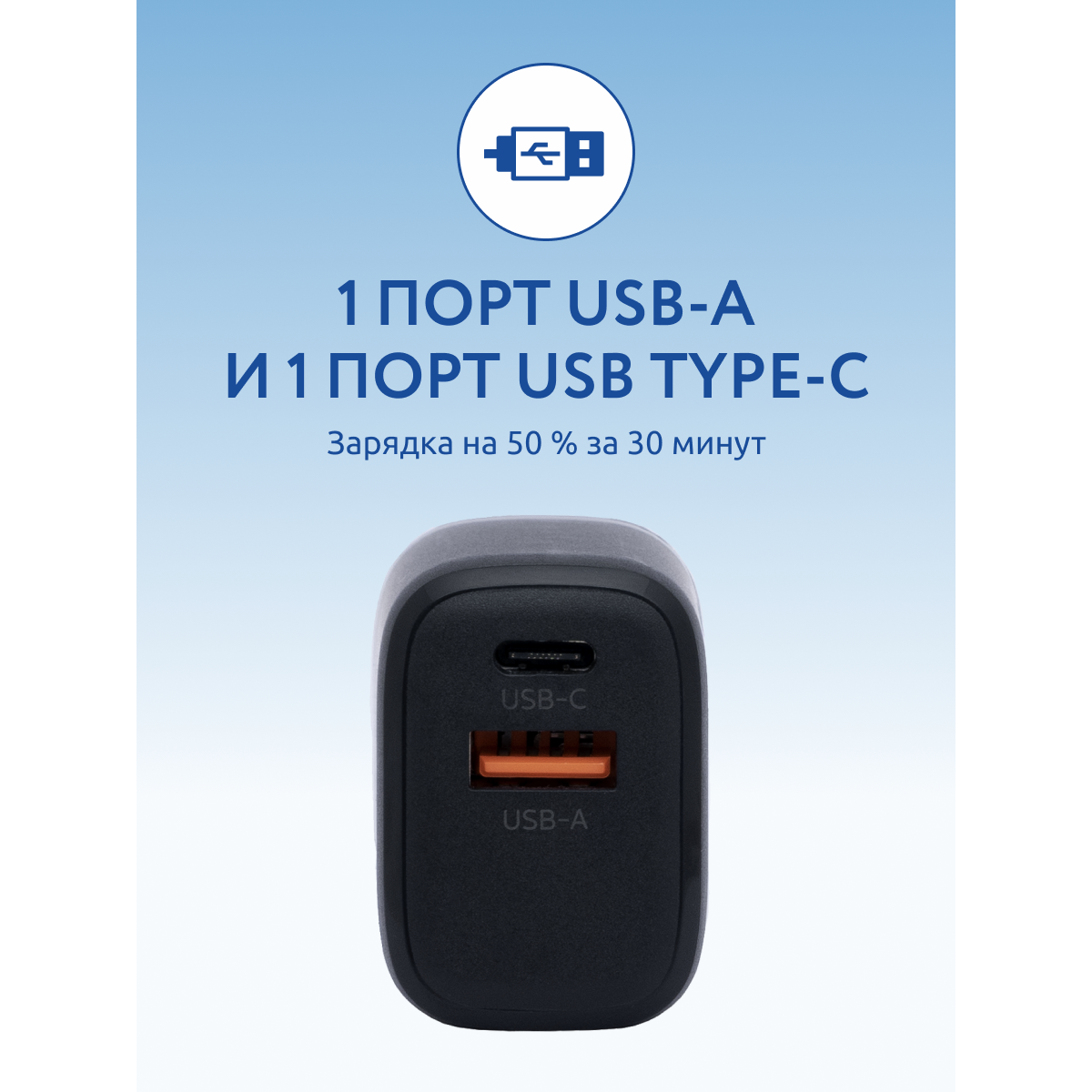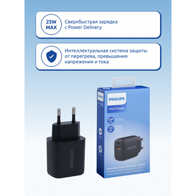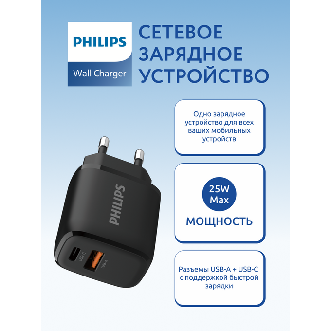 Зарядное устройство для телефона Philips DLP4327CB/70, USB-C и USB-A, 25W, быстрая зарядка QC3.0, чёрный