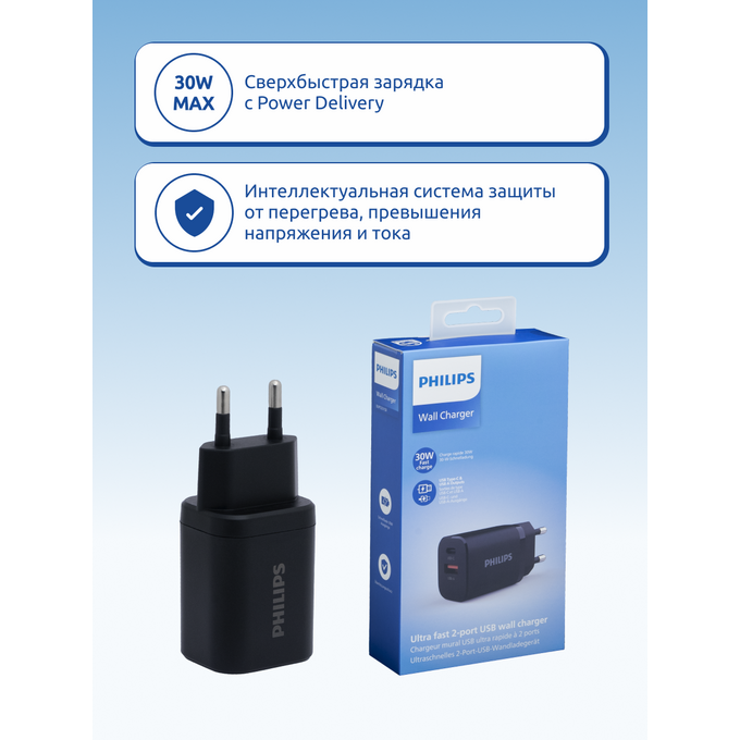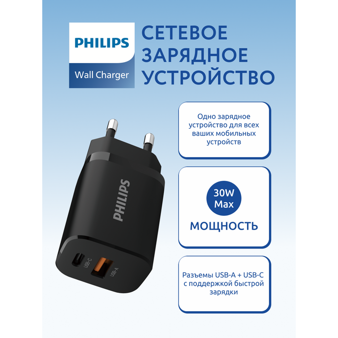 Зарядное устройство для телефона Philips DLP5331CB/74 GAN, USB-C и USB-A, 30W, быстрая зарядка QC3.0, чёрный