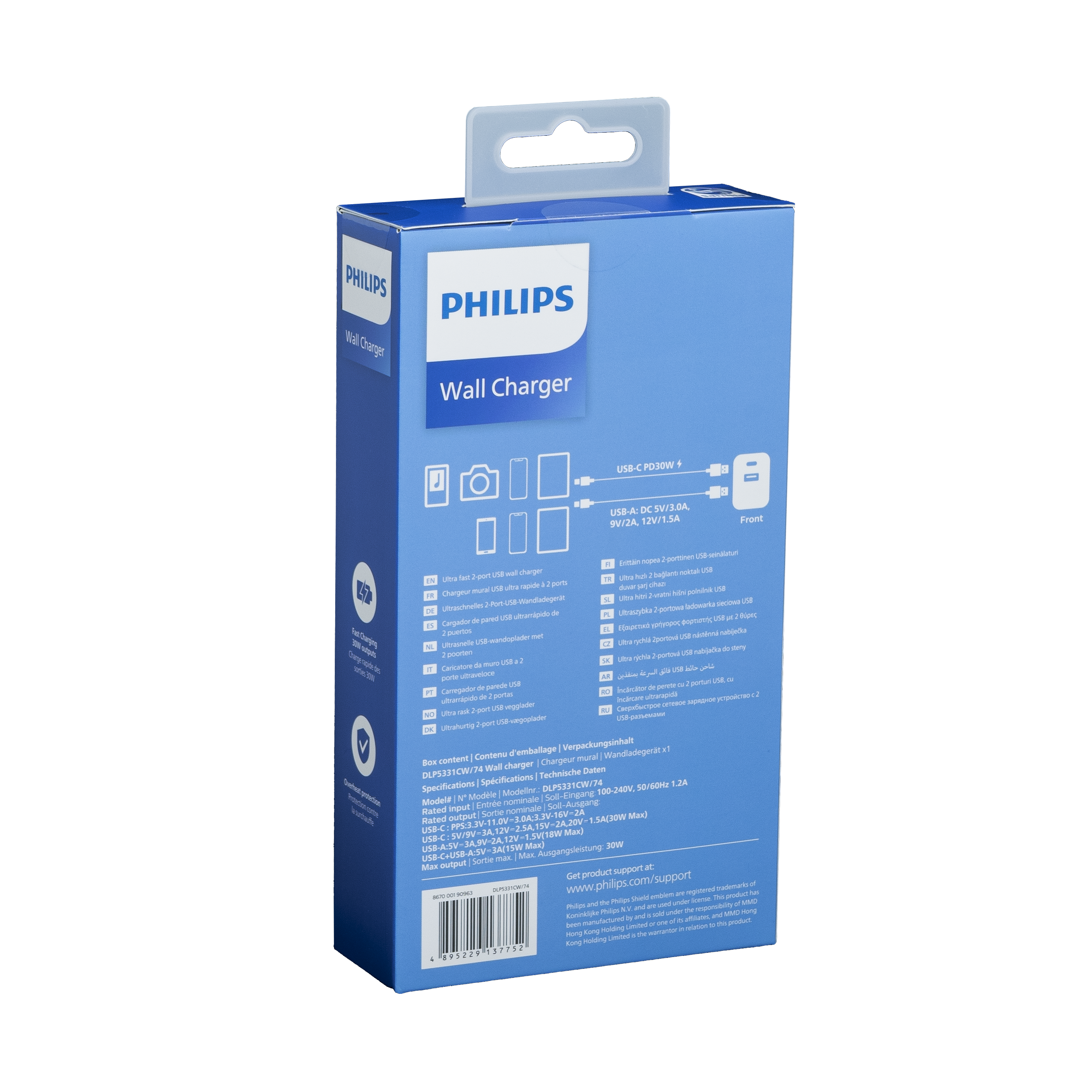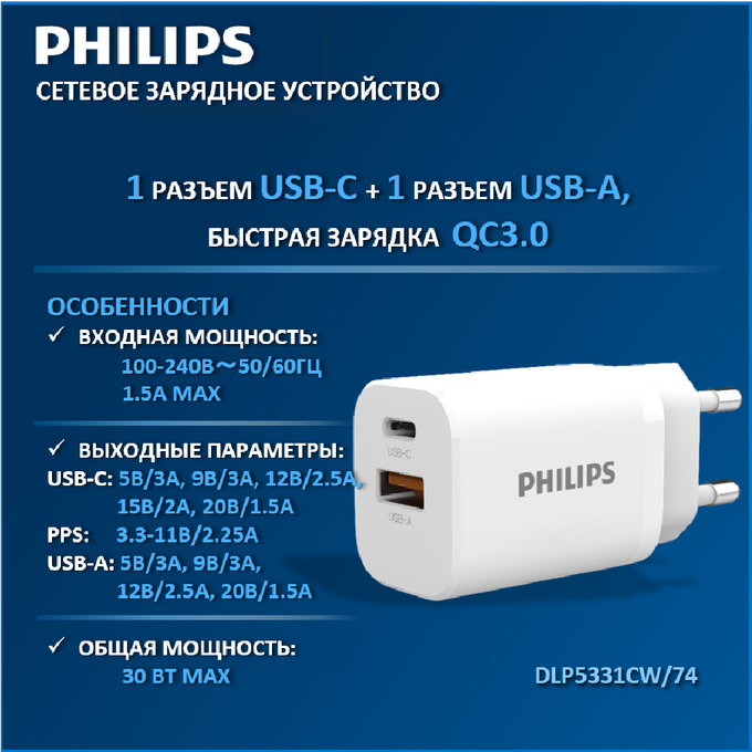 Зарядное устройство Philips GAN DLP5331CW/74 – идеальный выбор для тех, кто ценит скорость и компактность. С этим сетевым зарядным устройством вы сможете быстро и безопасно заряжать ваши устройства. Благодаря новейшей технологии GaN, этот зарядный блок для телефона предлагает высокую мощность, занимая при этом минимум места. Сетевые зарядные устройства, в которых используется технология GaN (нитрид галлия), потребляют меньше электрических компонентов и обладают лучшей теплоотдачей Компактные зарядные устройства обеспечивают большую мощность при более быстром времени зарядки. Благодаря повышенной мощности 30 Вт современные ноутбуки могут подключаться к USB-C. Миниатюрные размеры и легкий вес позволяют всегда иметь его под рукой, в кармане или сумке, что делает его идеальным компаньоном для путешествий и повседневного использования. Зарядное устройство обладает передовой технологией быстрой зарядки PD (Power Delivery), этот блок питания обеспечивает эффективную и быструю зарядку вашего телефона и других устройств. Он также обладает защитой от перегрузки и короткого замыкания, что обеспечивает безопасность вашего мобильного устройства во время зарядки.