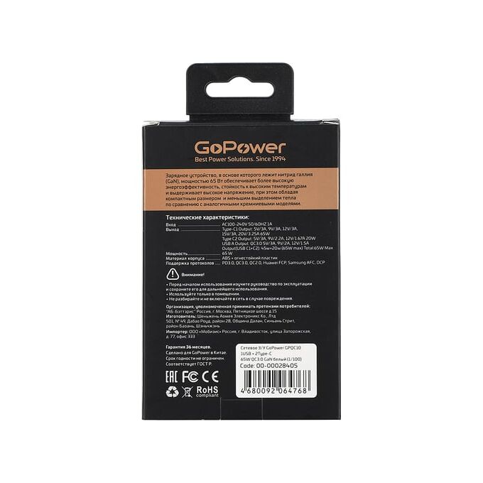 Зарядное устройство нового поколения GoPower GPQC10 создано для максимально быстрой и безопасной зарядки ваших устройств - телефона, планшета, наушников, повербанков и многих других гаджетов. Инновационная технология GaN на базе нитрида галлия позволяет быстро зарядить любые совместимые гаджеты, включая аудио и фото технику.