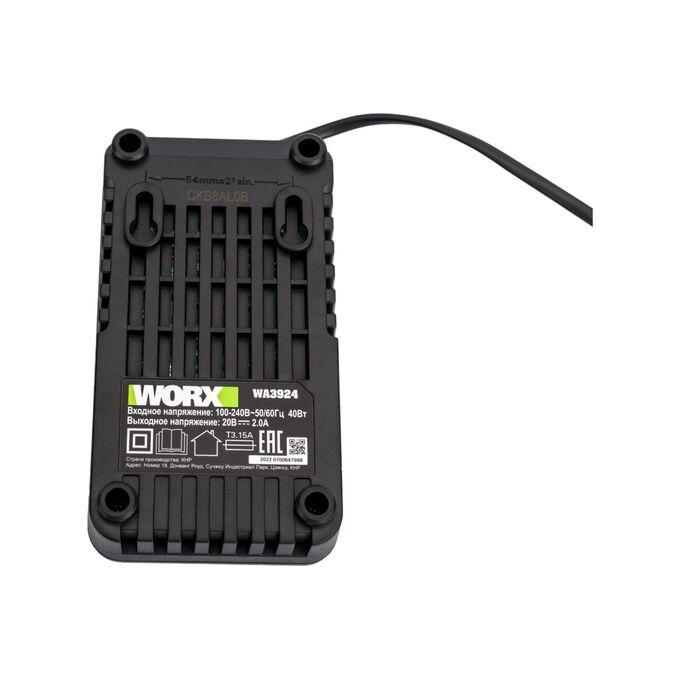 Зарядное устройство Professional WA3924 20В, 2Aч WORX WA3924 заряжает аккумуляторные батареи WORX Professional с напряжением 20В. Работает от сети 100-240В переменного тока с частотой 50-60Гц. Выходной ток – 2А.