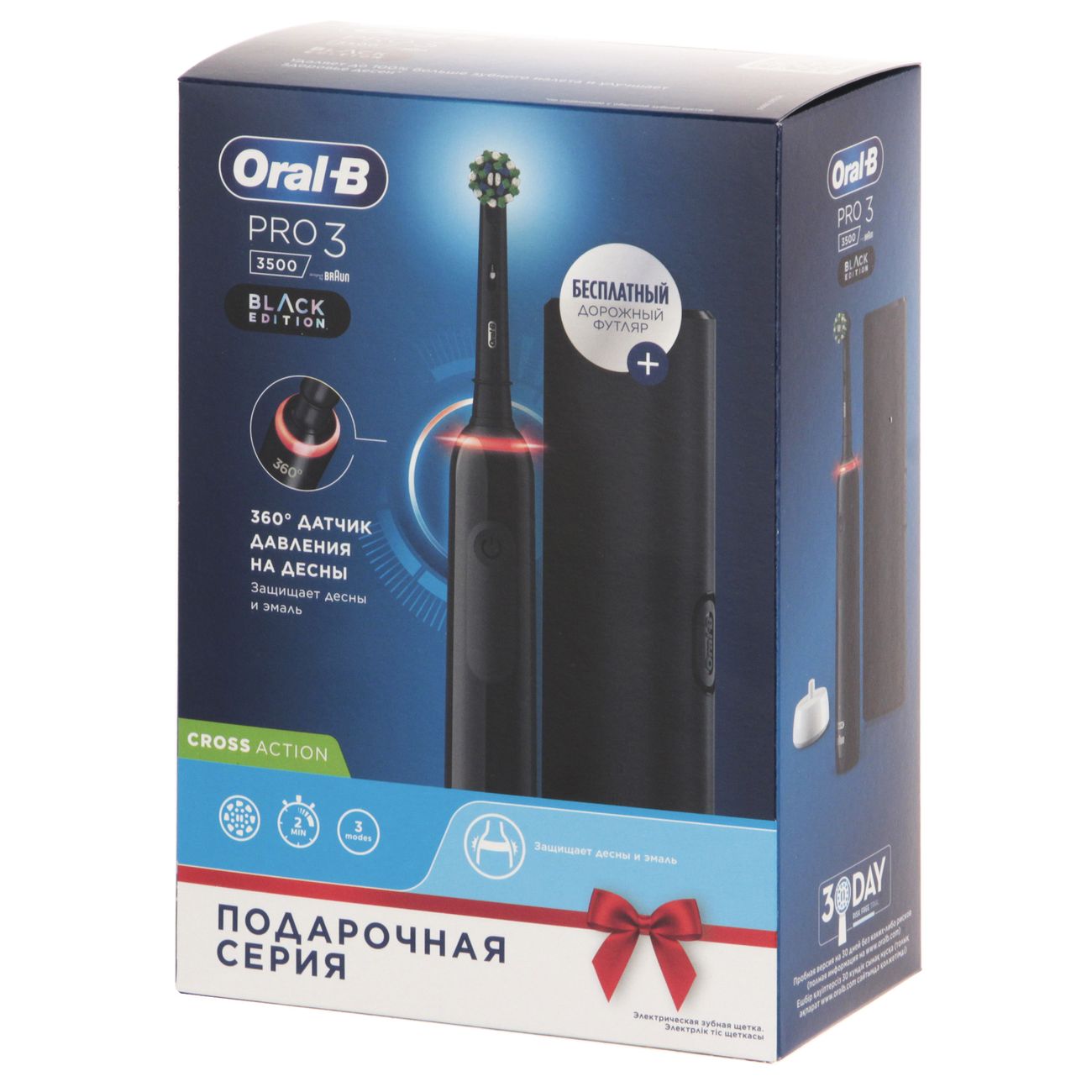 В наборе есть три сменные насадки. Cross Action предназначена для интенсивной чистки, Sensitive бережно воздействует на чувствительные участки, 3D White восстанавливает естественную белизну зубов.